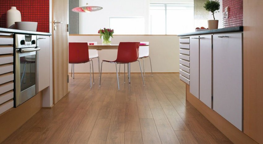 Влагостойкий ламинат подлежит влажной уборке и подходит для кухни