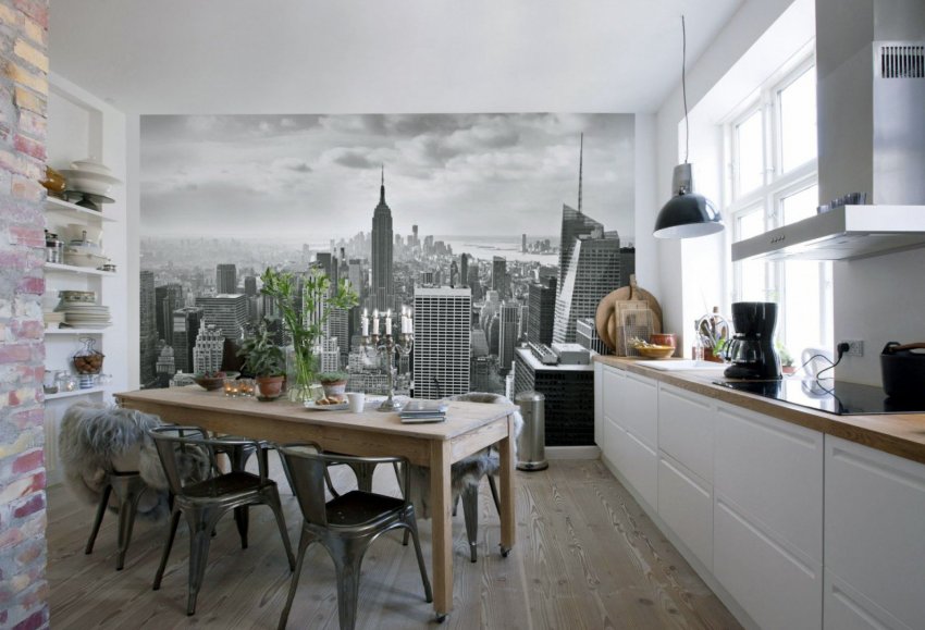Столовую зону кухни можно оформить городской панорамой