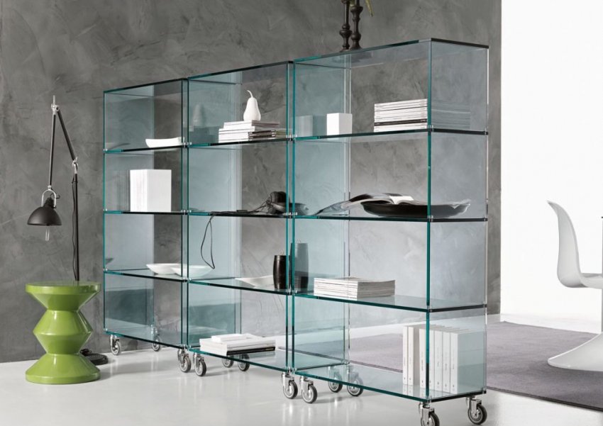 Стеллаж-перегородка со стеклом смотрится шикарно, но стоит дорого и сооружается только профессионалами