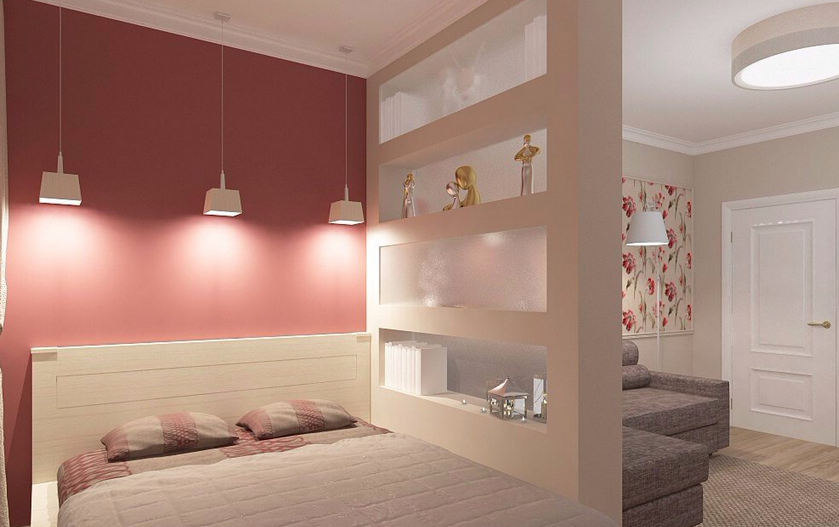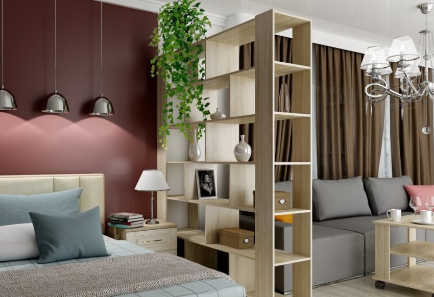Стеллаж-перегородка позволяет одну комнату разделить на две, не возводя стен