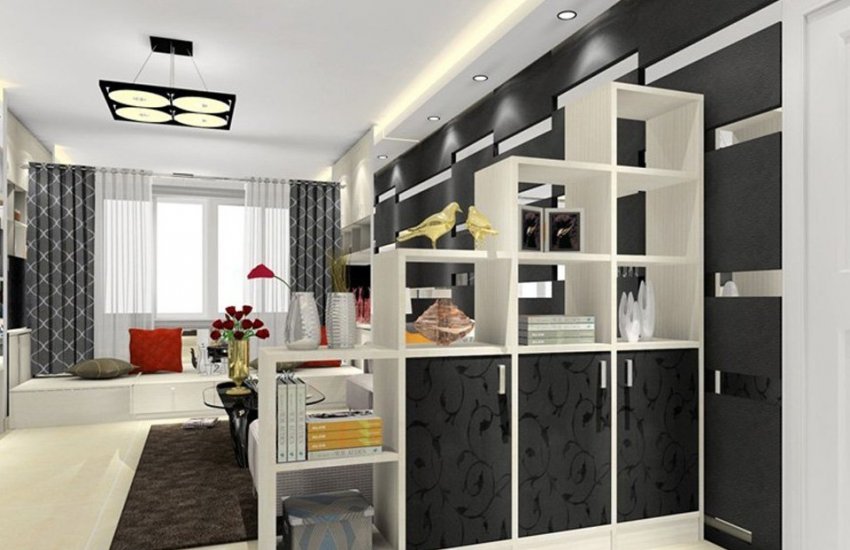 | Со стеклянными вставками | Односторонняя или двухсторонняя конструкция со стеклом Последний вариант позволяет класть вещи с обеих сторон стеллажа | Однокомнатная квартира семьи с ребёнком, где частично стеклянный стеллаж отделит детей от родителей, предоставляя последним возможность следить за малышами Комната, где совмещены зона отдыха с диваном и спальня |