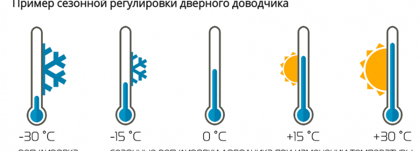Так как внутри большинства доводчиков находится масло, регулировки надо проводить в тёплое и холодное время года. Это связано с тем, что при изменении температуры густота масла также меняется и от этого будет зависеть плавность работы устройства.