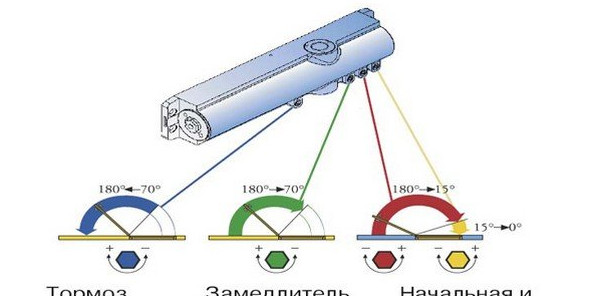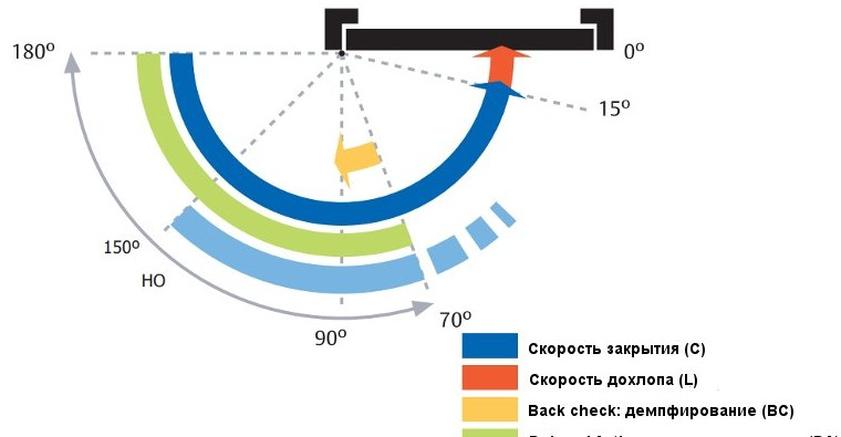 - конечная скорость закрывания. Эта функция доводчика обеспечивает резкое снижение скорости закрывания дверного полотна, что предотвращаете его сильный удар о коробку. Срабатывает она приблизительно в 10–15° перед дохлопом;