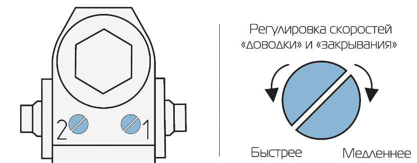 В зависимости от конструкции доводчика местонахождение регулировочных винтов будет отличаться. Несмотря на это, регулировка выполняется по одной схеме — при вращении винтов по часовой стрелке скорость и усилие механизма увеличиваются и наоборот.