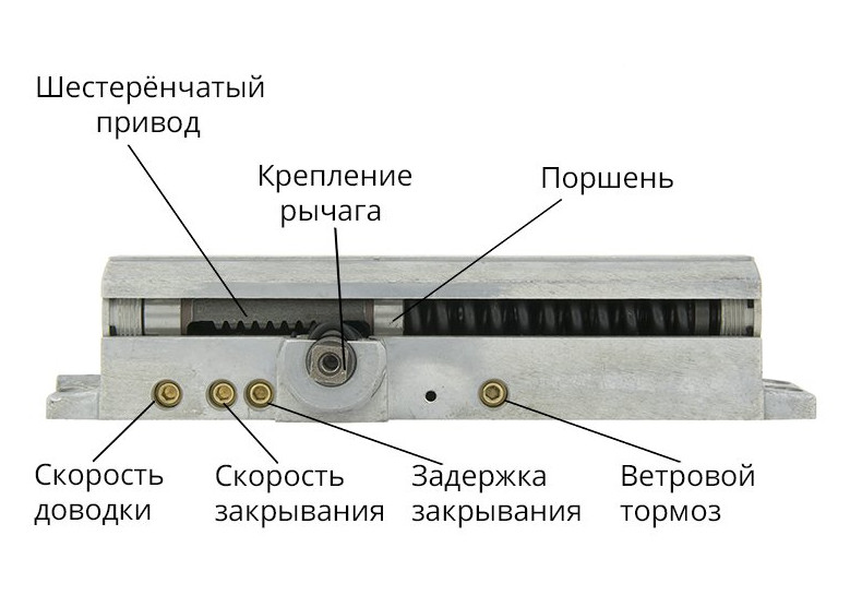 Работа зубчатого доводчика обеспечивается за счёт имеющихся в нём шестерёнок