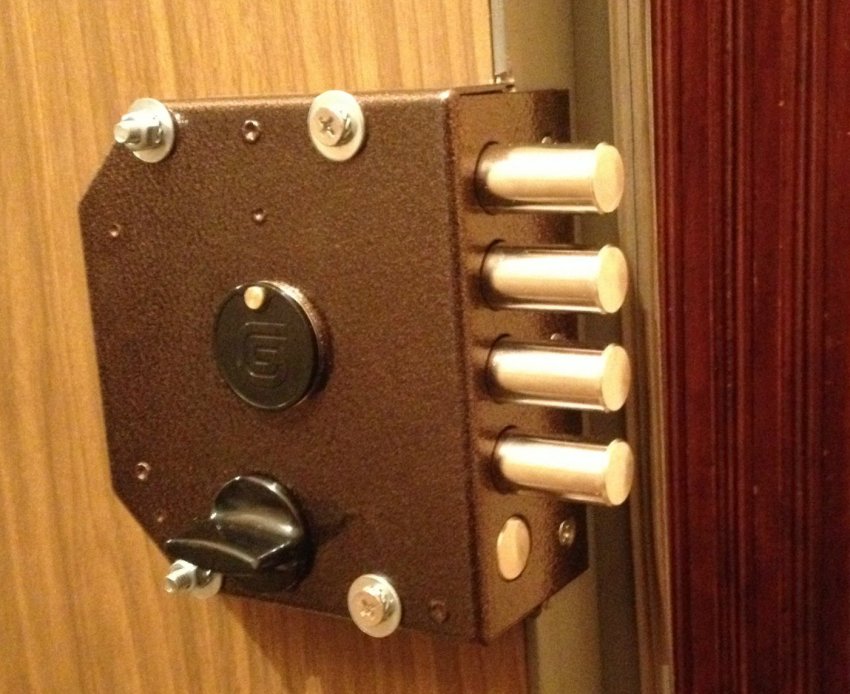 На входной двери накладной замок обычно используется как дополнительное запорное устройство