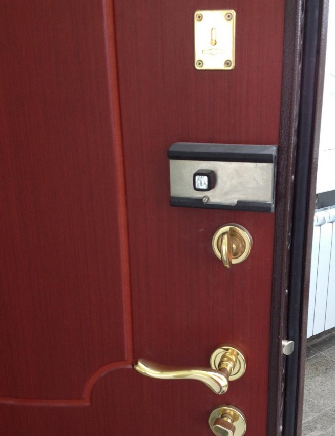 - при установке на дверь, открывающуюся внутрь помещения, его будет достаточно просто вскрыть путём выдавливания дверного полотна;