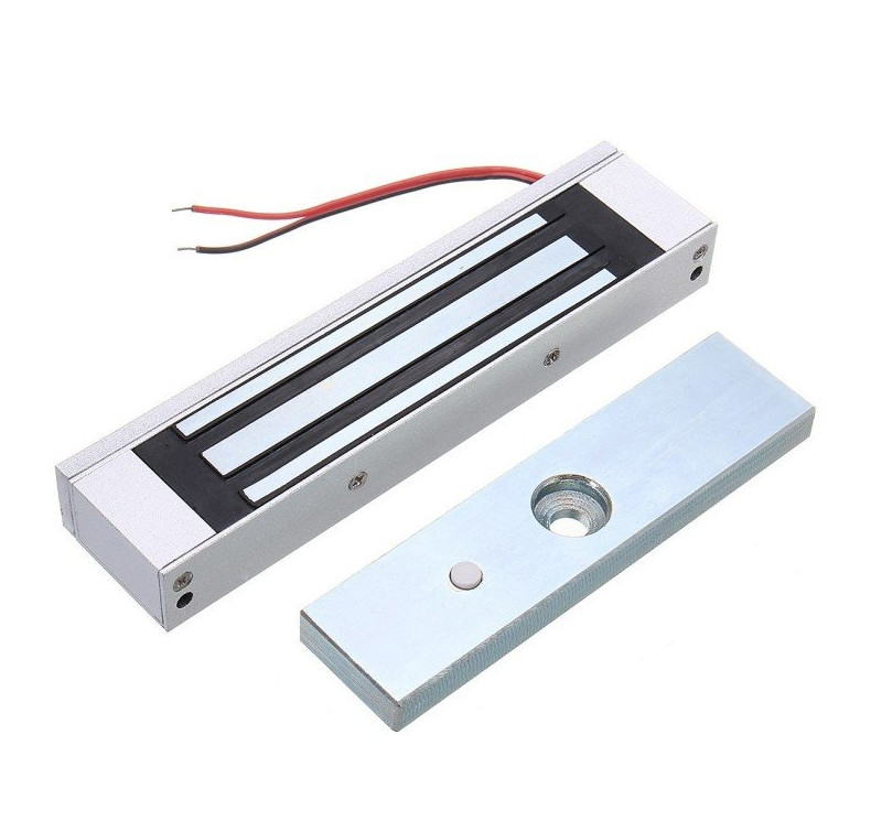 - Электромагнитные. Устройства очень надёжные, так как в их составе нет трущихся деталей, поэтому и срок службы у них большой. Они работают бесшумно, а то, что без подачи напряжения они находятся в открытом положении, позволяет устанавливать их на аварийные выходы. Принцип работы такой же, как у простого электромагнита. При наличии напряжения срабатывает сердечник и притягивает к себе ответную планку замка, обеспечивая надёжное закрывание дверного полотна. Сила, необходимая для отжатия полотна, может быть разной — есть замки, у которых усилие отжатия составляет до одной тонны. Важное значение имеет остаточная намагниченность. Для открывания двери должно затрачиваться усилие, не превышающее 2 кг, в таком случае её сможет открыть даже ребёнок. Электромагнитные замки могут быть удерживающими и сдвиговыми, их отличие понятно из названия. Минус всех электромагнитных замков в том, что при отсутствии напряжения в сети они будут открытыми, поэтому рекомендуется устанавливать аварийные источники питания, а использовать такие замки рекомендуется вместе с другими запорными устройствами.