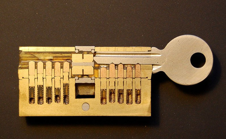 - Сувальдный. В таком замке имеются специальные пластины, которые ещё называют сувальдами. Для его открывания надо при помощи ключа расположить пластины в правильном порядке. Чем больше сувальд в замке, тем выше его надёжность. Современные механизмы снабжают системами распознавания отмычек, делают на пластинах ложные пазы, оснащают блокировочными системами, что значительно повышает безопасность и надёжность таких устройств. В старых сувальдных замках при потере ключа приходилось менять замок. Есть модели, которые можно перепрограммировать под новый ключ, поэтому разбирать замок и менять секрет не надо. К недостаткам таких моделей стоит отнести наличие сквозного отверстия, через которое можно подбросить в дом посторонние предметы или прослушать разговор, и большой размер ключа, из-за чего его неудобно носить.