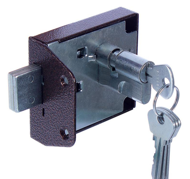 - Реечный. Изнутри такой механизм закрывают при помощи ручки, которой сдвигают рейку, а снаружи — специальным ключом. Безопасность реечных замков невысокая, поэтому в домах и квартирах их обычно не используют, а вот для подсобных помещений, калиток и бытовок такие устройства вполне подойдут. Они отличаются высокой надёжностью, поэтому безотказно работают даже в сложных условиях.