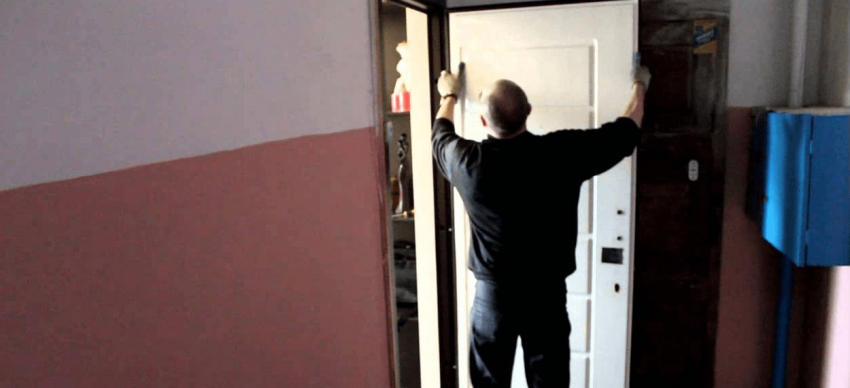 - Демонтаж фурнитуры. Снимают всю фурнитуру (замок, ручки, глазок, табличку), которая будет мешать проведению работ. Если петли не внутренние, их также снимают.
