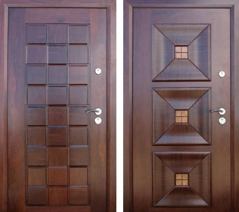 - Деревянные накладки. Они изготавливаются из натуральной древесины. В зависимости от способа декорирования, такие элементы могут быть окрашенными, лакированными, ламинированными или шпонированными. Для входных дверей частного дома лучше использовать окрашенные или лакированные панели, так как они не боятся высокой влажности. Для дверей квартиры можно выбрать ламинированные или шпонированные изделия.