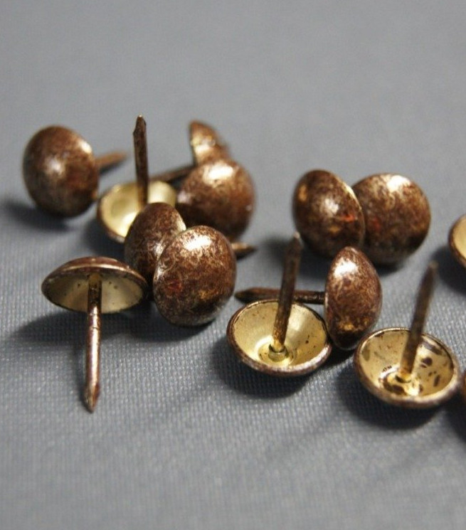 - обивочные гвозди. Для фиксации дерматина применяются декоративные гвозди с широкой шляпкой. Оптимальным вариантом будет, если цвет шляпок совпадёт с оттенком ручек и замка. Можно приобрести гвозди, у которых шляпки обтянуты дерматином. Их можно брать в тон основной обивке или использовать контрастное решение;