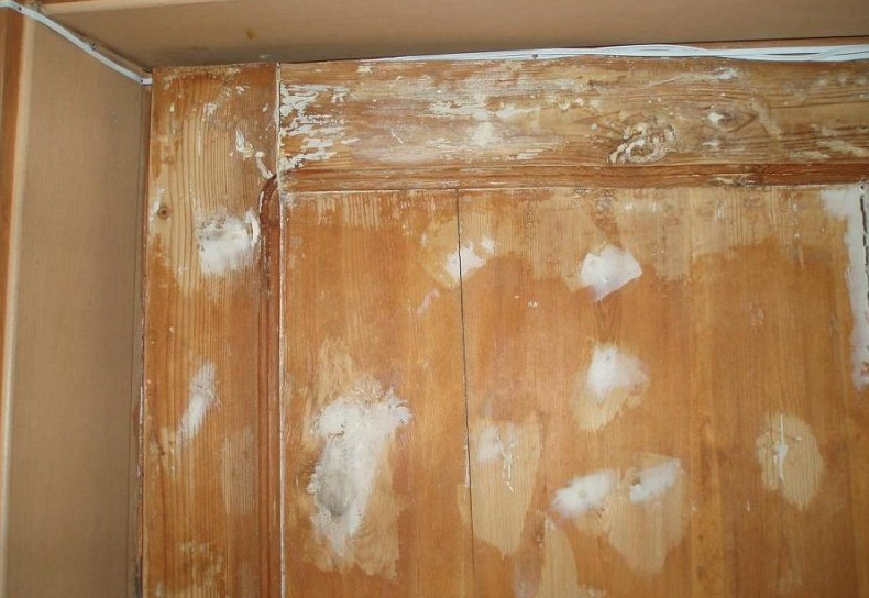 - Осмотр состояния двери. Если на деревянной двери выявлена плесень или большие трещины, то эти места обрабатывают специальными препаратами, а щели замазывают клеящим герметиком. Очаги коррозии металлической поверхности зачищают от ржавчины и красят. Мелкие недостатки в виде незначительных сколов и трещин устранять не надо, так как их скроет дерматин.