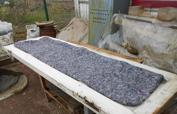 На полотно укладывают ватин или поролон и фиксируют степлером