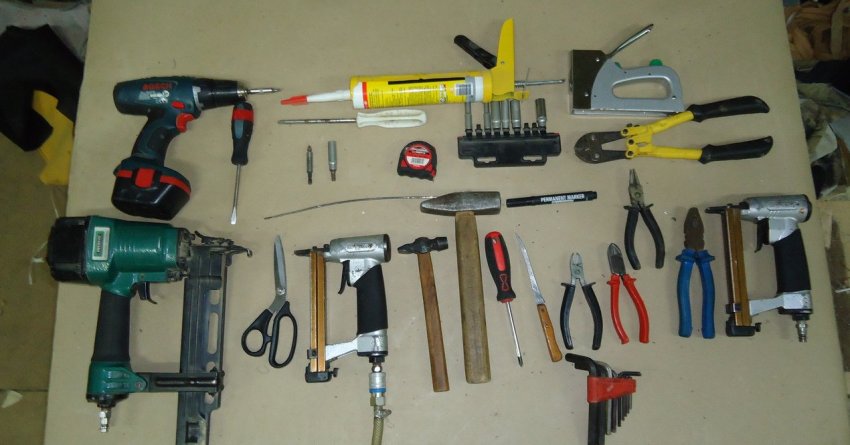 Чтобы обить дверь своими руками, надо иметь простые инструменты, которые обычно имеются у каждого домашнего мастера: