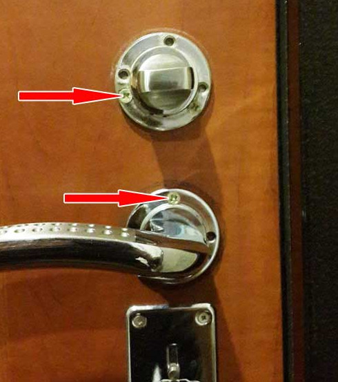 - С дверей удаляется вся фурнитура, препятствующая доступу к личинке. Это, как правило, дверные ручки, защитные и декоративные накладки. Демонтаж осуществляется выкручиванием фиксирующих шурупов.