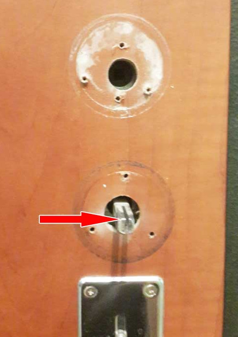 - Удаляем четырёхгранный (бывает и трёхгранный) стержень, соединяющий дверные ручки.