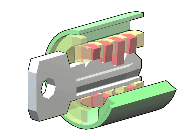 Ключ проворачивается в замке только тогда, когда комбинация штифтов совпадает с выточками на ключе