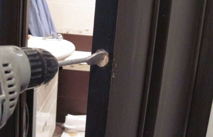 - Создание отверстий. По выполненной разметке на торце полотна и с обеих его сторон делают отверстия. Для этого используется электродрель, перьевое сверло или коронка необходимого диаметра. Чтобы на поверхности двери не появились сколы, отверстие для монтажа квадрата надо делать с обеих сторон. Сначала полотно просверливают наполовину с одной стороны, а потом то же самое делают с другой.