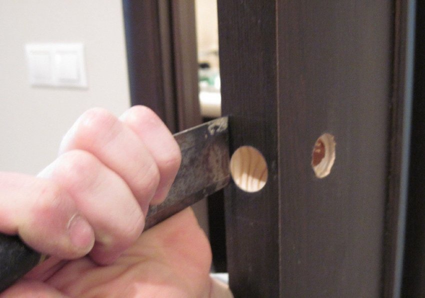 Место для установки защёлки углубляют при помощи молотка и стамески