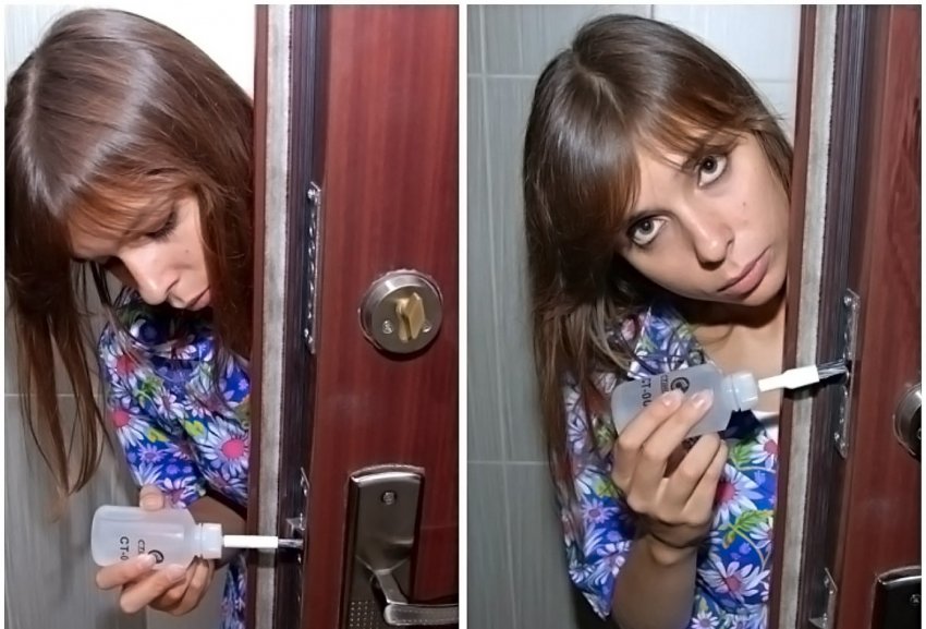 Достаточно нанести смазку на язычок и несколько раз нажать ручку