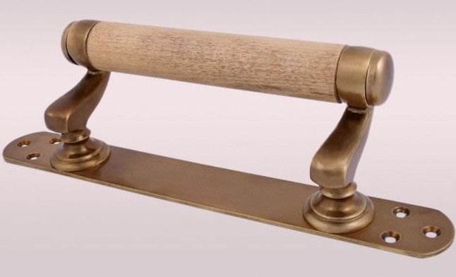 - для бани. Рукоятка обычно делается из дерева, а крепление — из металла. На дверь со стороны парилки такую ручку устанавливать не стоит, а для других помещений бани это будет идеальный вариант;