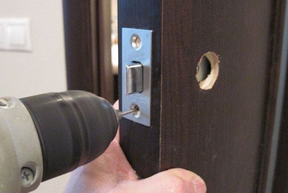 - Монтаж защёлки. Её устанавливают в подготовленное отверстие и фиксируют на торце двери при помощи саморезов. Чтобы защёлка не заедала, перед её монтажом отверстие надо продуть воздухом и удалить остатки древесной пыли.