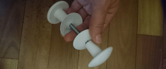 - Монтаж парных ручек. Сначала надо выполнить разметку, после чего сделать электродрелью со сверлом необходимого диаметра отверстие для стягивающего стержня. Осталось вставить стержень и накрутить на него обе ручки.