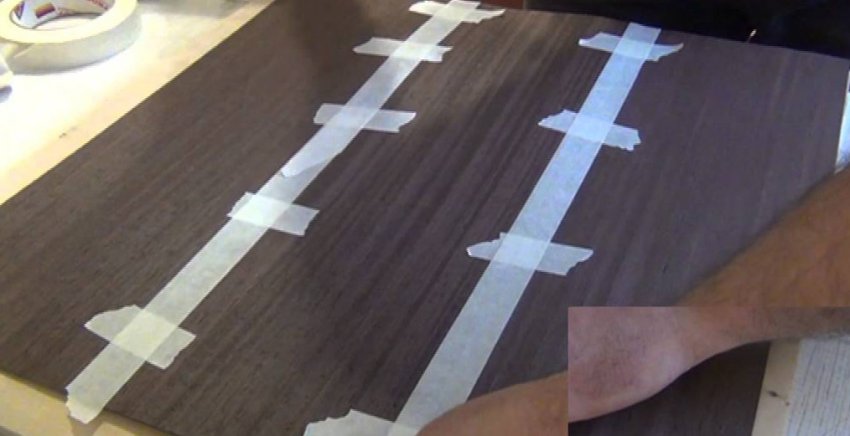 Для лучшего склеивания полос шпона края фиксируются бумажным скотчем