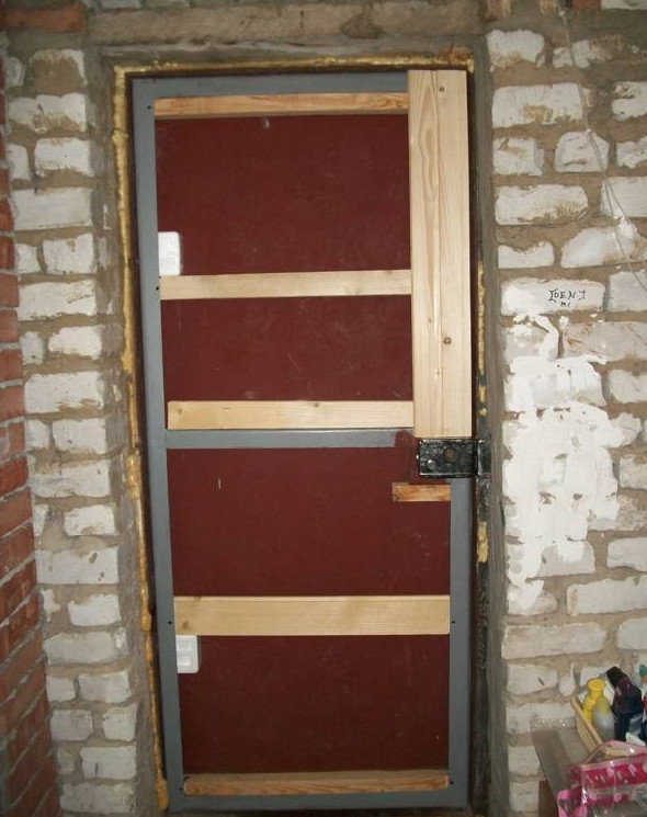 В металлических дверях деревянные бруски крепятся к рёбрам жёсткости