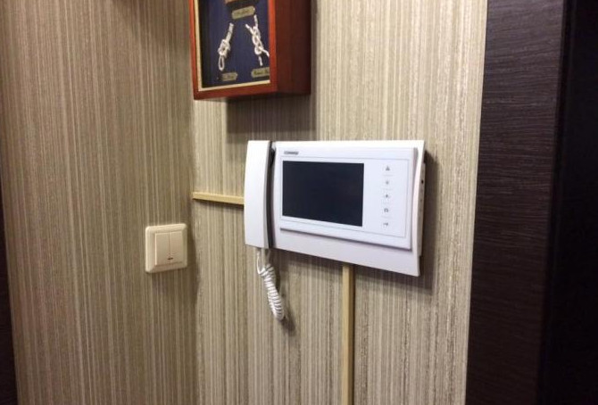 - В помещении на высоте 150–160 см от пола крепят к стене дюбелями монитор. Место обычно выбирается рядом с дверью, кабель питания включается в розетку, если она есть поблизости или прокладывается до электрического щитка.