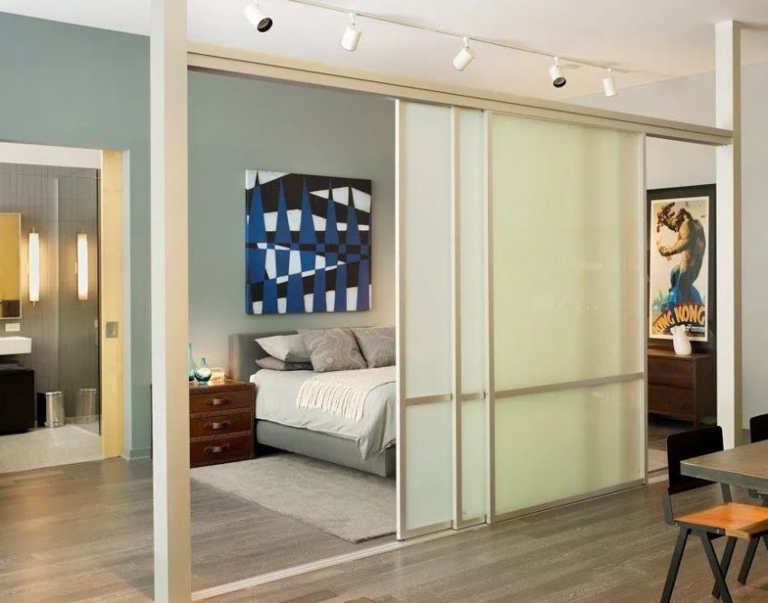 В комнате с перегородкой из матового стекла будет светло и уютно