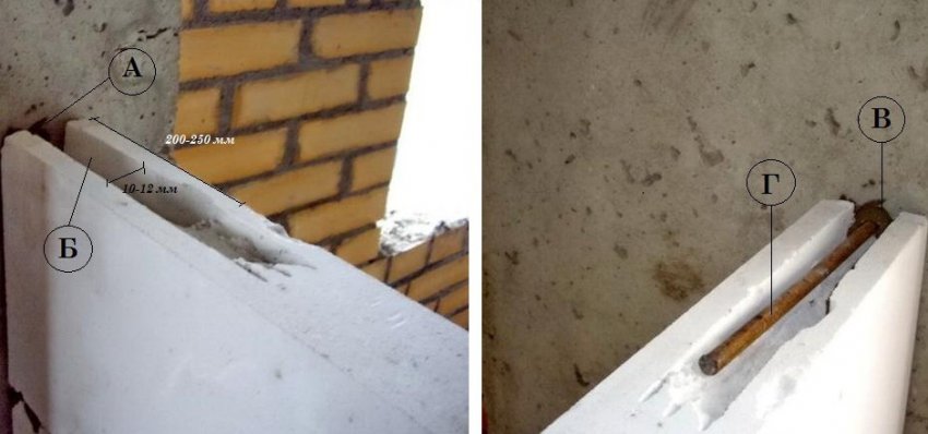 - Закрепить стену с помощью арматуры. Для этого в капитальной стене нужно сделать отверстия, а в пеноблоке — штробу длиной 20–25 см. Отверстие заполнить монтажным клеем или цементно-песчаным раствором, а затем вставить в него отрезок арматуры.