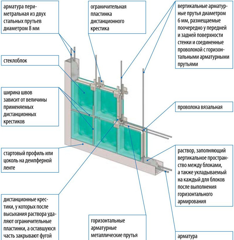 - Сначала необходимо обустроить цоколь высотой в два кирпича или более. Основа может быть и деревянной. Конструкция из стеклоблоков не может быть самостоятельной, ей обязательно нужна надёжная опора со стороны пола и капитальной стены. Дополнительно надо выполнить армирование, выложив два прута параллельно друг другу. Допускается установка каркаса из пластика или дерева. Каждому стеклянному блоку должна соответствовать своя ячейка. Каркас нужно прикрепить к стене, полу и потолку шурупами. В соответствующие ячейки установить блоки, используя резиновый уплотнитель.