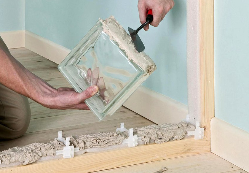 Начинать строительство перегородки из стеклоблоков можно после укладки стяжки пола, но до финишной его обработки. При этом укладка стеклоблоков напоминает кладку кирпича, но толщина швов составляет приблизительно 1 см. Дополнительной финишной обработки такая перегородка не требует. Единственное правило — грамотная расшивка швов, то есть заполнение их специальным цветным материалом. Для этого очень удобно использовать тонкий шпатель.