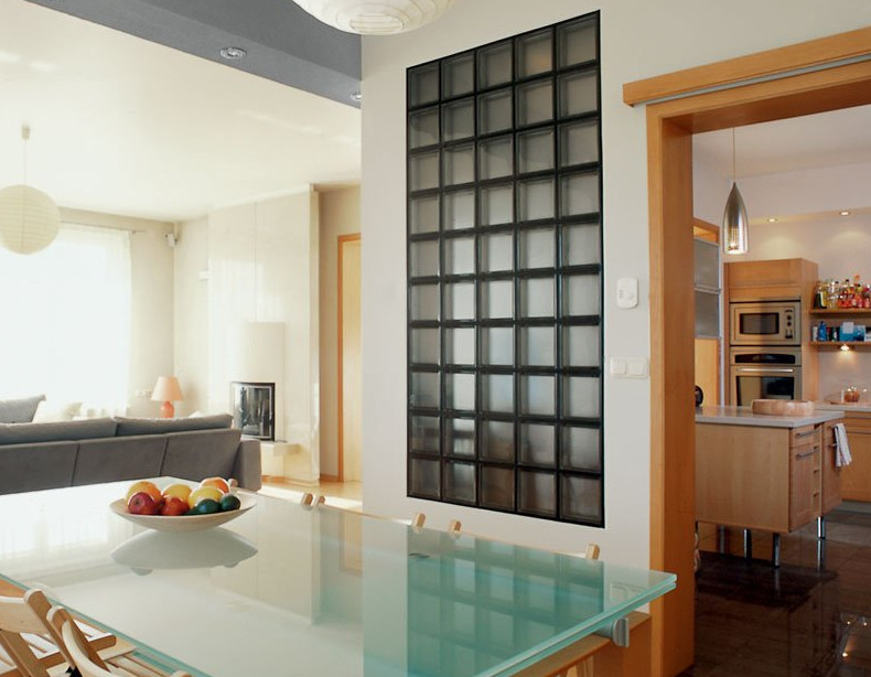 - Стеклянными. Главным преимуществом такой конструкции является высокая светопропускная способность. Благодаря этому есть возможность оградить часть комнаты без окна, сохранив при этом достаточный уровень естественного освещения. Стекло может быть абсолютно прозрачным, рельефным или с рисунком. Возможно также использование зеркальных элементов для визуального расширения пространства комнаты. Особой популярностью пользуются стеклоблоки. По внешнему виду они напоминают кирпичики со стеклянными стенками, но внутри находится воздух, позволяющий пропускать свет и при этом обеспечивать хорошую звукоизоляцию. Стандартные стеклоблоки имеют размеры 190х190 или 240х240 мм при толщине 80 или 100 мм.