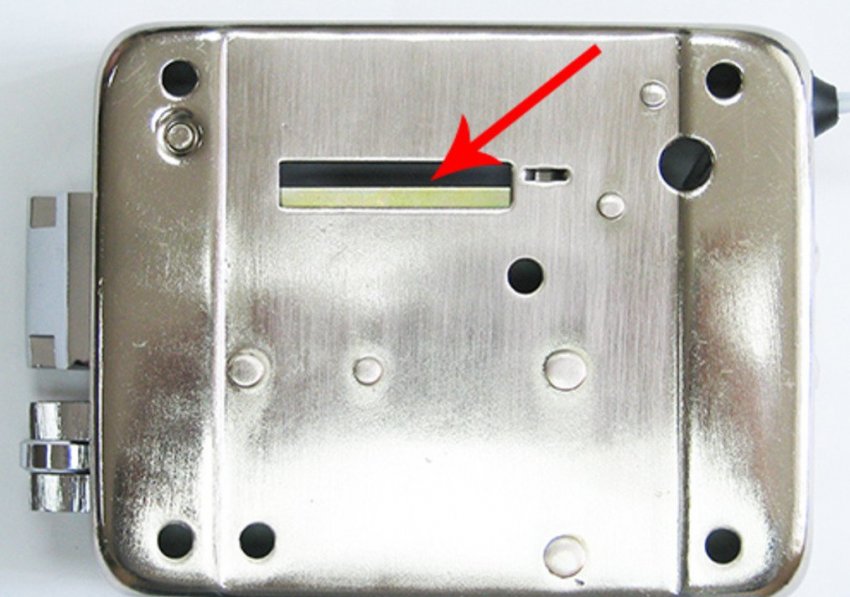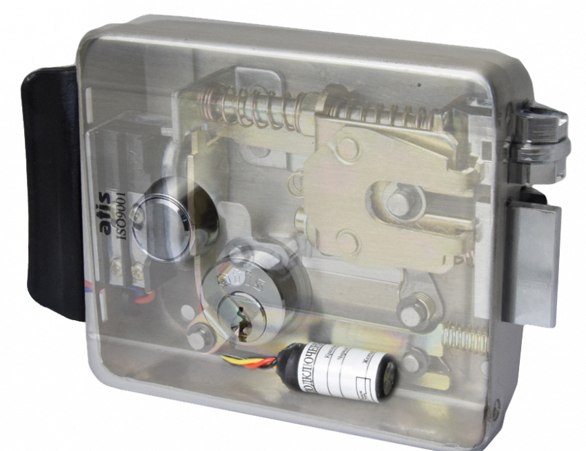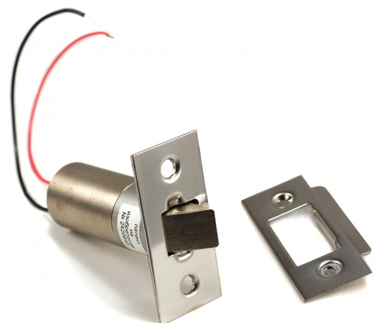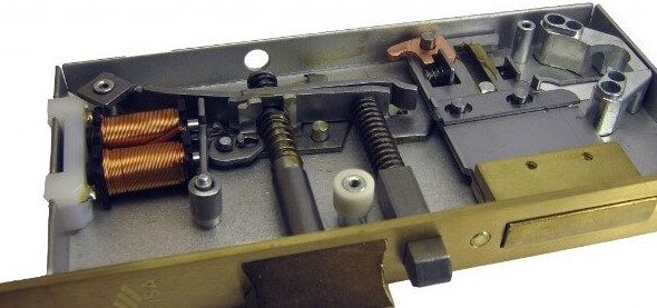 Замок с электроблокировкой имеет защёлку с мощной пружиной, которая не позволяет несанкционированно открыть двери