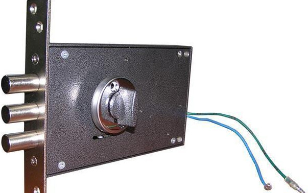 Запорный ригель подключён к электроприводу, обеспечивающему надёжное запирание двери. Монтаж такого замка ничем не отличается от установки аналогичных механических моделей, кроме того, что надо ещё проложить провода к устройству управления.
