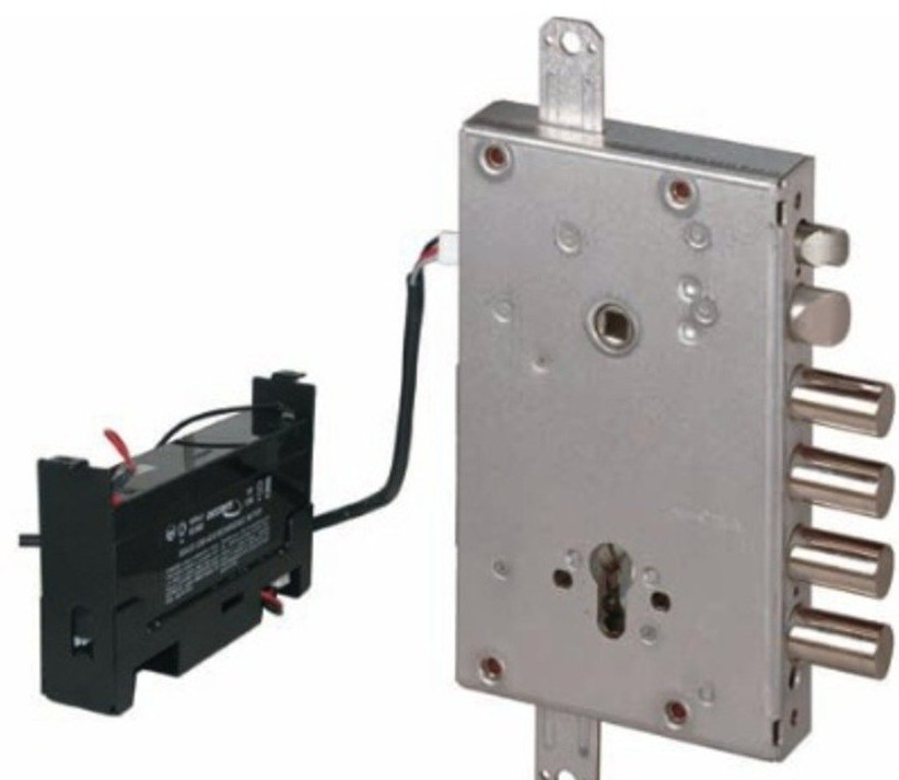 - Моторные. В составе такого устройства есть маленький электромотор, при помощи которого осуществляется управление ригелем замка. Так как на ригель оказывается большое давление, то его нельзя отжать при взломе двери. Если в замке несколько ригелей, то в дневное время может работать только один, а на ночь закрываются все. Если втягивается ригель при помощи мотора, то назад он возвращается под действием пружины. В блоке управления есть таймер, который позволяет выводить засов из ответной планки через 2–20 с. Такая конструкция имеет большое время открывания, поэтому в быту применяется редко, обычно она используется в банках, финансовых и правительственных зданиях.