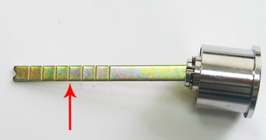 - Устанавливают цилиндр. Надо отмерить необходимую длину язычка и лишнюю часть отломать.