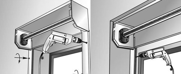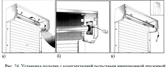 - Устанавливают полотно в направляющие и заводят его в короб с задней стороны. Полотно должно пройти над валом. Затем верхнюю ламель закрепляют на валу и накручивают пружину (количество витков берут из инструкции), после чего при помощи специальной скобы её фиксируют.