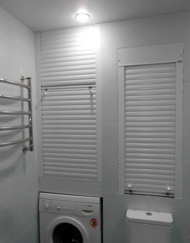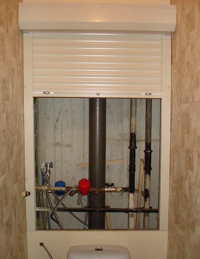 При помощи рольставней в туалете закрывается ниша с коммуникациями