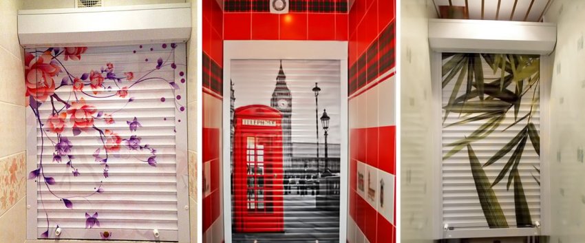 Для решения проблемы с оформлением туалета современные дизайнеры используют такое решение, как рольставни. В этом случае они имеют другое назначение, чем те, что используются на окнах — служат для оформления ниши, в которой находятся коммуникации. Так как эти рольставни не должны обеспечивать защиту от взлома, а выполняют декоративную роль, для их изготовления используют облегчённые материалы.
