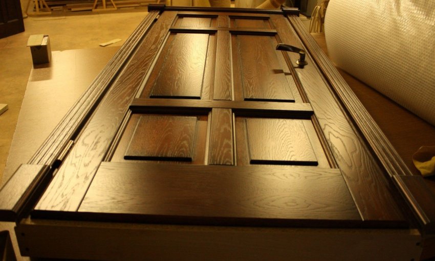 При таком способе реставрации отремонтированные участки останутся заметными. Скрыть их поможет отделка двери.