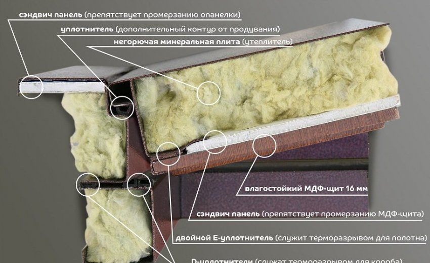 Дверное полотно металлической уличной двери состоит из нескольких слоёв, один из которых выполнен из теплоизоляционного материала