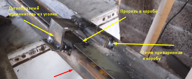- Верхнюю часть («мама») приваривают к удлинителю в виде дуги, а уже его фиксируют на дверном полотне. Таким образом создаётся и вторая петля.