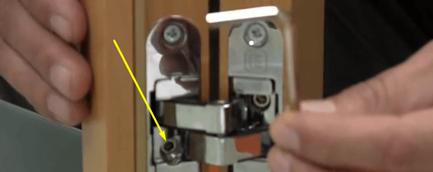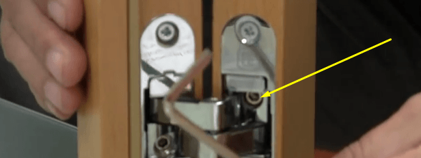 - По горизонтали. Для этого надо при помощи шестигранника поворачивать регулировочный винт, находящийся на правой стороне петли вверху. Таким образом, полотно выравнивается с обеих сторон относительно короба, при этом величина регулировки составляет 1 мм.