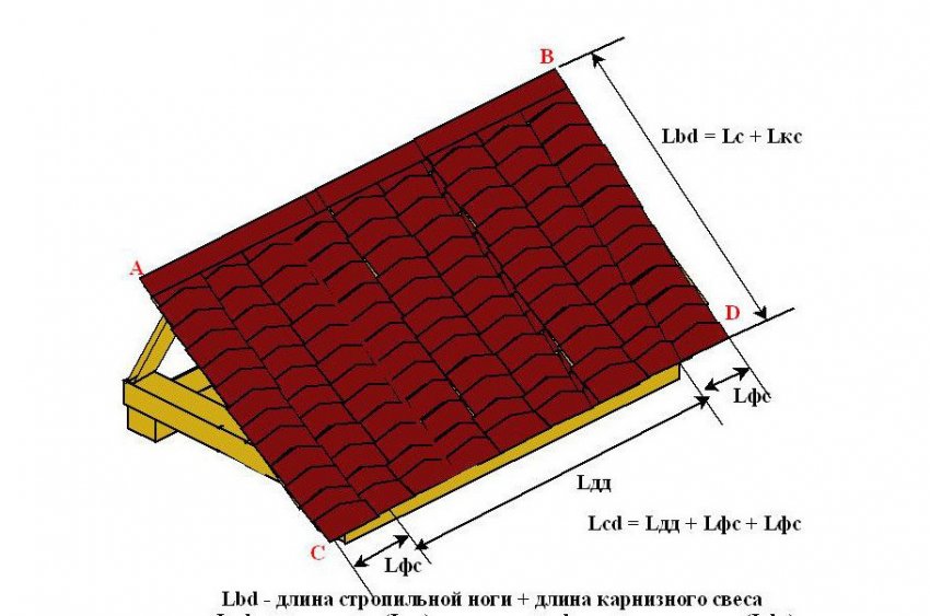 На простом чертеже обозначаются размеры ската с учётом фронтального и карнизного свесов