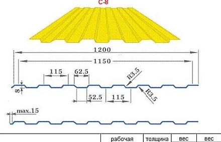- Ширина профлиста С-8 составляет 1200 мм, но рабочей (с учётом вертикальных и горизонтальных нахлёстов) считается ширина 1150 мм. Исходя из этого, вычисляем количество листов в одном (горизонтальном) ряду. 8м/1,15м = 6,95. Округляем в большую сторону и получаем 7 листов. Теперь посмотрим, сколько будет рядов. Для этого 5 м делим на 0,95 — рабочую длину листа. Получаем 5,3 ряда. Перемножив 7 на 5,3, узнаем количество листов профнастила, необходимое для покрытия одного ската: 7х5,3 = 37,1 шт. Для всей площади крыши 37,1 х 2 = 75,2 листа. Округляем до целого значения и получаем 76 листов.